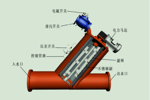 當(dāng)水從入水口進(jìn)入過濾器濾筒內(nèi)部,雜質(zhì)被攔截在過濾筒內(nèi)壁,過濾后干凈的水從出水口流出,當(dāng)濾筒內(nèi)壁的雜質(zhì)較多時,過濾器進(jìn)出口的壓差達(dá)到預(yù)設(shè)值或達(dá)到清洗時間或手動控制時,過濾器將開始自清洗。