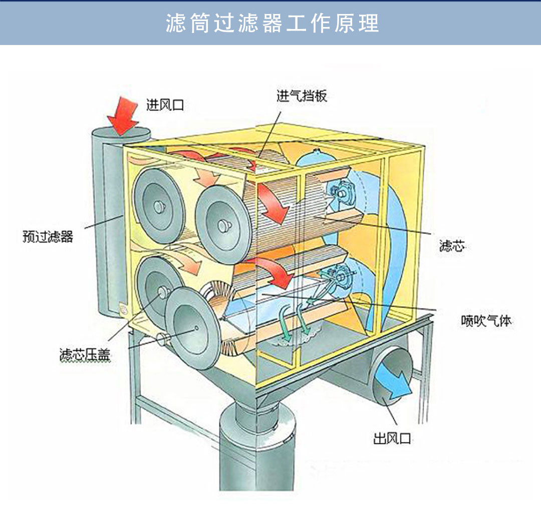 1、采用了先進的沉流式布局及濾筒斜裝結構,因而濾筒除塵器在工作過程中同步清灰效果好。
