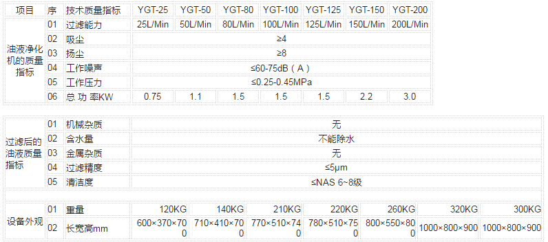 凈化處理后的油質(zhì)接近新油標(biāo)準(zhǔn):外觀:透明,雜質(zhì):無(wú),過(guò)濾精度:小于5μm。是電廠和使用工業(yè)氣輪機(jī)廠家凈化處理各種油液的理想設(shè)備。按每分鐘凈化油量(升)有七個(gè)型號(hào):YGT-25,50,80,100,125,150,200型。