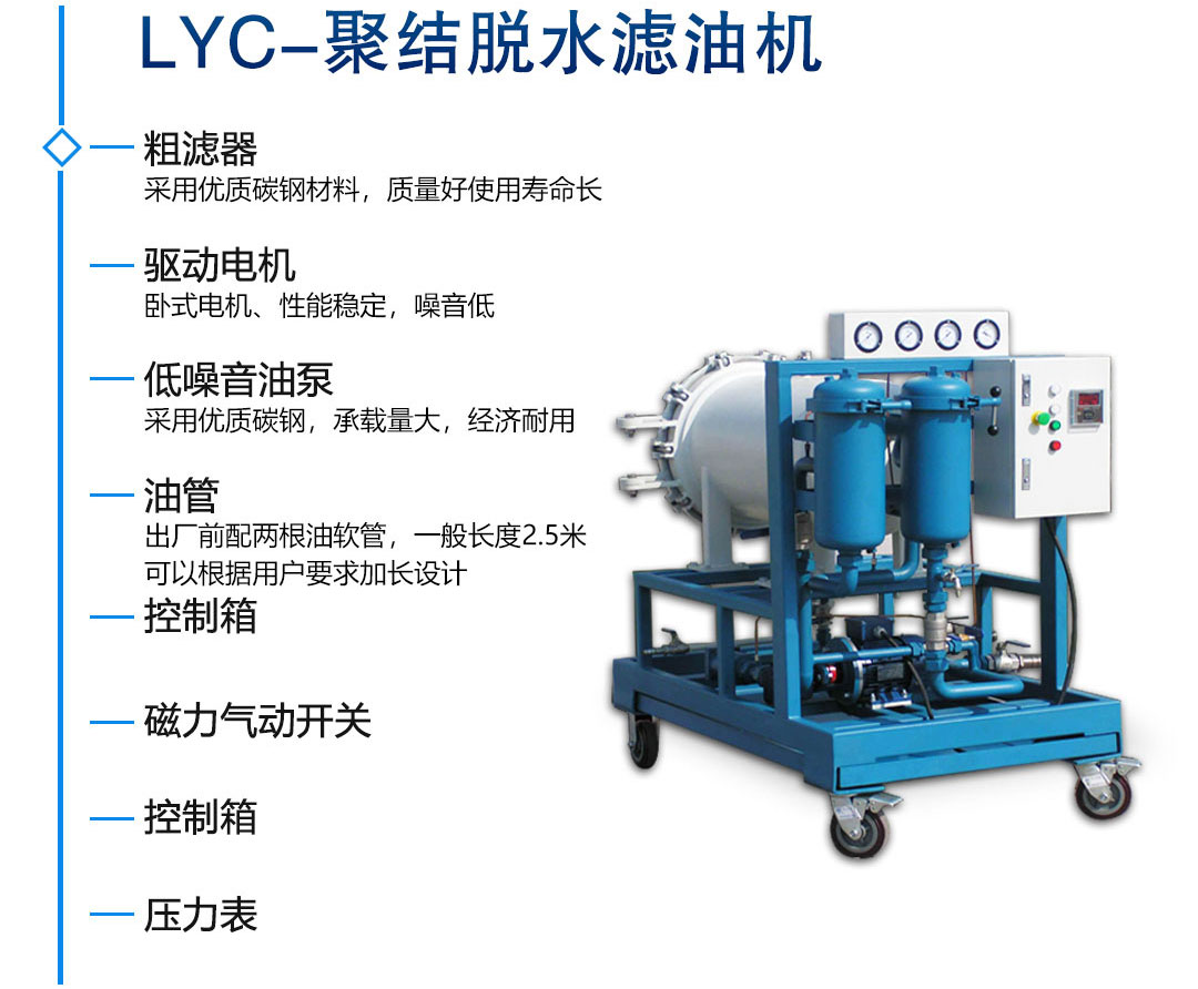 LYC-50J系列聚結脫水濾油機共有五級過濾系統,集精密過濾器及高效脫水兩種功能為一體。引進美國的聚結分離技術進行脫水,脫水效率高。能力強,尤其適應于對油液中大量的水進行分離,遠勝于離心法的脫水能力,可破除介質中全部的油水乳化結構;聚結脫水濾油機通過顆粒過濾系統的過濾,可將介質的清潔度穩定的控制在系統要求的狀態,以保證油液的清潔度;不改變有也得物理、化學性質,延長油液的使用壽命;能耗小,運行費用低;系統配置優質,連續工作性能強,適合在線運行。