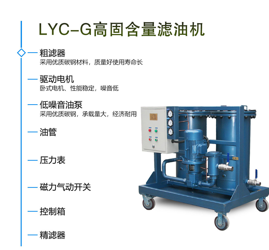 LYC-100G三級(jí)過濾高固含量濾油機(jī)適應(yīng)于高固體含量的場(chǎng)合,尤其適應(yīng)廢油再生及食品油的澄清過濾。該濾油機(jī)采用特殊的過濾材料做濾芯,其濾層厚度大,是一般濾材的10~15倍,過濾效率高,能有效除去液體中的懸浮物、微粒、鐵銹等。我公司生產(chǎn)的該款濾油機(jī)采用科學(xué)的設(shè)計(jì),緊湊的結(jié)構(gòu),可以承受很高的過濾壓力。同時(shí)獨(dú)特的深層網(wǎng)孔結(jié)構(gòu),使它具有極高的納污容量。濾芯的組成部分單一,化學(xué)性能穩(wěn)定,與介質(zhì)具有良好的相容性。