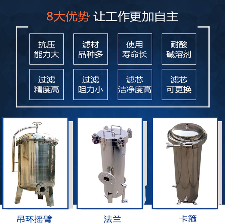 內襯四氟單袋式過濾器是一種結構新穎、體積小、操作簡便靈活、節能、高效、密閉工作、適用性強的多用途過濾設備。本過濾器主要有過濾筒體、過濾筒蓋和快開機構、不銹鋼濾袋加強網等主要部件組成,濾液由過濾機外殼的旁側入口管流入濾袋,濾袋本身是裝置在加強網籃內,液體滲透過所需要細度等級的濾袋即能獲得合格的濾液,雜質顆粒被濾袋攔截。該機更換濾袋十分方便,過濾基本無物料消耗。