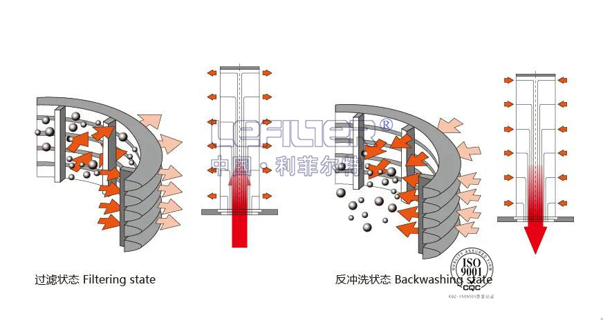 水由入口進(jìn)入,首先經(jīng)過粗濾網(wǎng)濾掉較大顆粒的雜質(zhì),然后到達(dá)細(xì)濾網(wǎng)。在過濾過程中,細(xì)濾網(wǎng)逐漸累積水中的臟物、雜質(zhì),形成過濾雜質(zhì)層,由于雜質(zhì)層堆積在細(xì)濾網(wǎng)的內(nèi)側(cè),因此在細(xì)濾網(wǎng)的內(nèi)、外兩側(cè)就形成了一個(gè)壓差。當(dāng)自清洗過濾器的壓差達(dá)到預(yù)設(shè)值時(shí),將開始自動(dòng)清洗過程,此間凈水供應(yīng)不斷流,清洗閥打開,清洗室及吸污器內(nèi)水壓大幅度下降,通過濾筒與吸污管的壓力差,吸污管與清洗室之間通過吸嘴產(chǎn)生一個(gè)吸力,形成一個(gè)吸污過程。同時(shí),電力馬達(dá)帶動(dòng)吸污管沿軸向做螺旋運(yùn)動(dòng)。吸污器軸向運(yùn)動(dòng)與旋轉(zhuǎn)運(yùn)動(dòng)的結(jié)合將整個(gè)濾網(wǎng)內(nèi)表面清洗干凈。整個(gè)沖洗過程只需數(shù)十秒鐘。排污閥在清洗結(jié)束時(shí)關(guān)閉。過濾器開始準(zhǔn)備下一個(gè)沖洗周期。