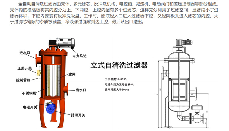 水由進水口進入過濾器,首先經過粗濾芯組件濾掉較大顆粒的雜質,然后到達細濾網,通過細濾網濾除細小顆粒的雜質后,清水由出水口排出。在過濾過程中,細濾網的內層雜質逐漸堆積,它的內外兩側就形成了一個壓差。當這個壓差達到預設值時,將開始自動清洗過程:排污閥打開,主管組件的水力馬達室和水力缸釋放壓力并將水排出;水力馬達室及吸污管內的壓力大幅下降,由于負壓作用,通過吸嘴吸取細濾網內壁的污物,由水力馬達流入水力馬達室,由排污閥排出,形成一個吸污過程。當水流經水力馬達時,帶動吸污管進行旋轉,由水力缸活塞帶動吸污管作軸向運動,吸污器組件通過軸向運動與旋轉運動的結合將整個濾網內表面完全清洗干凈。整個清洗過程將持續數十秒。排污閥在清洗結束時關閉,增加的水壓會使水力缸活塞回到其初始位置,過濾器開始準備下一個沖洗周期。在清洗過程中,過濾機正常的過濾工作不間斷。