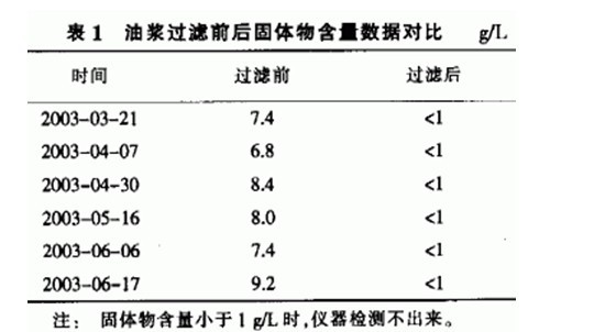主要設(shè)備:2臺引進(jìn)的過濾器是技術(shù)核心,另有干氣罐和濾餅罐及氣體放空緩沖罐各一臺。共有17個程序閥門參與程序控制。主要工藝控制關(guān)鍵點(diǎn):過濾器正向差壓任何時(shí)刻不得大于0.7 MPa。過濾器反向差壓任何時(shí)刻不得大于0.4 MPa,濾餅罐液控設(shè)5%報(bào)警下限,防止壓空。 2.2 過濾器運(yùn)行效果 油漿過濾器系統(tǒng)設(shè)計(jì)能力為8 t/h,在經(jīng)歷了安裝、吹掃、試壓、程序調(diào)試后于2003年3月投入運(yùn)行,總體運(yùn)行平穩(wěn)。但初期也遇到過一些問題,如2個過濾器的卸料閥因開關(guān)不到位影響了卸料效果;濾餅罐定壓值給定偏低,影響正常的濾餅壓送。2003年7月曾發(fā)現(xiàn)過濾后油漿固體物升高,過濾器差壓變小,直至2004年3月裝置停工改造時(shí)過濾器停運(yùn),打開檢查發(fā)現(xiàn),每組過濾器都有1根濾芯被壓破。2004年4月再次投入運(yùn)行后一直到2005年5月裝置停工:濾芯清洗后于2005年8月再次投入運(yùn)行。 該過濾器在正常生產(chǎn)時(shí)油漿過濾前后數(shù)據(jù)對比見表1。