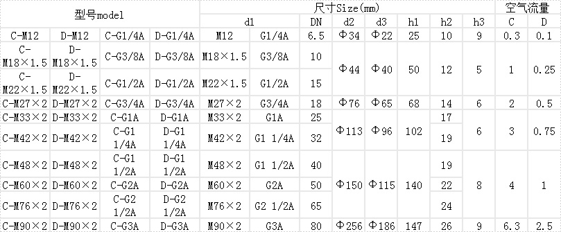 一.產品簡介 C 型空氣濾清器適用于減速器排氣用。它能維持減速器箱體內的壓力和大氣壓力平衡,并防止贓物顆粒從外部進入箱體,保持箱體內油液的清潔,延長減速器的使用壽命 . 二.技術參數及連接尺寸 型號model 尺寸Size(mm) 空氣流量(m3/min) d1 DN d2 d3