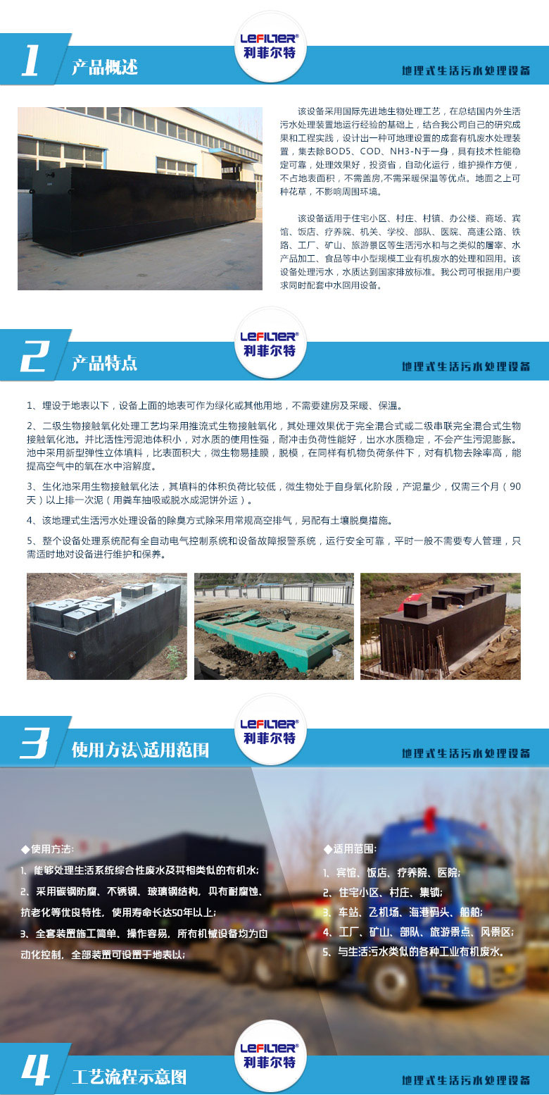 該設備采用國際先進的生物處理工藝,在總結國內外生活污水處理裝置的運行經驗基礎上,結合我公司自己的研究成果和工程實踐,設計出一種可地理設置的成套有機廢水處理裝置,集去除BOD5、COD、NH3于一身,具有技術性能穩定,處理效果好,投資省,自動化運行,維護操作方便等特點。