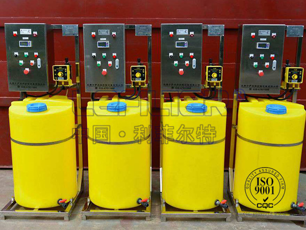 加藥裝置組成結構:溶液箱、液位計、計量箱、攪拌器、加藥計量泵、安全閥、壓力表、控制柜、閥門及管路集中布置,各部件材質主要分不銹鋼和碳鋼襯膠。