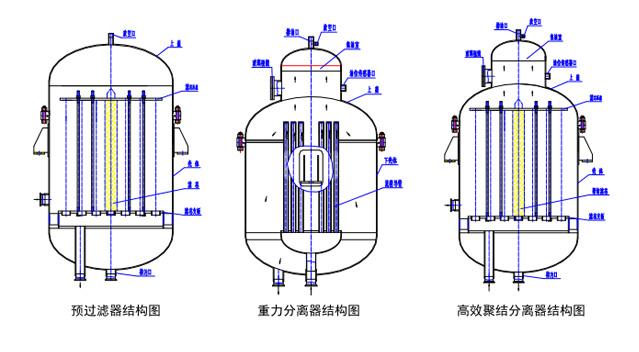⑸ 重力分離器利用流程長(zhǎng)的特性,使細(xì)小的油粒充分接觸并逐漸長(zhǎng)大并上浮,超過(guò)80%的油在這一級(jí)被聚集排出,只有很少量的細(xì)小油粒被輸送到較后一級(jí)-高效聚結(jié)分離器內(nèi),因此重力分離器能夠大大延了聚結(jié)濾芯的使用壽命。