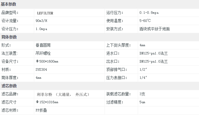 利菲爾特大流量保安過濾器結構為圓柱形殼體,材質為304或,316L不銹鋼;配以單支或多支濾芯。